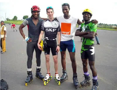 Grâce aux ventes des combinaisons WICOACH et aux stages encadrés en Europe, l’association World Inline Coach a pu financer un stage au Cameroun. Stage destiné au patineurs et entraineurs. Aussi avec l’aide précieux de Rémi Hubert, nous avons pu faire parvenir des patins complets. Rémi est parti en février avec 40 Kg de bagages et après quelques péripéties avec les douanes, choses courantes en Afrique, les patins et roues ont pu être offerts aux patineurs courses les plus méritants.